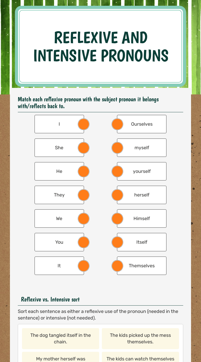 Intensive and reflexive pronoun exercises · 1. I boughtmyselfa new pair of sunglasses for our trip to the beach. The pronoun himself can be either a reflexive or an intensive pronoun, depending on how it is used. The soldiers themselves do notwantto attack . You can do the exercises online or download the worksheet as pdf.